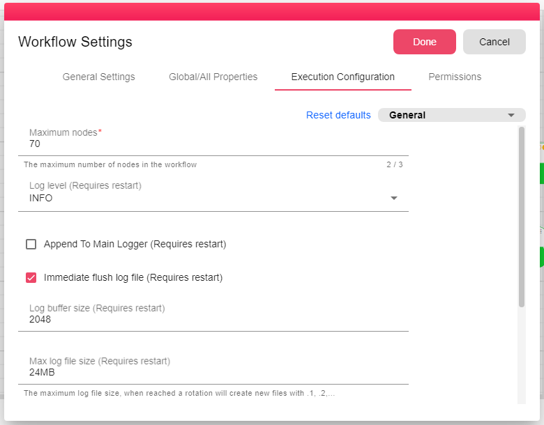 In order to have configuration activated the workflow should be reloaded, after you have changed a configuration you can click on the Done button to activate them.