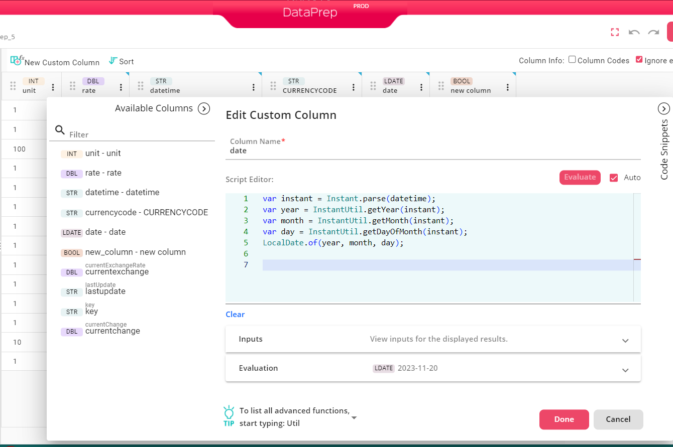 Col_firstName + " " + Col_lastNameExample 2: Create a New LocalDateTime Column