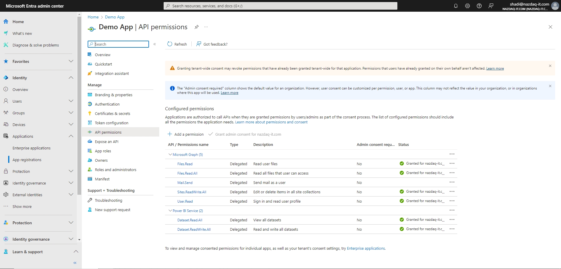 Next go to API permissions and add these permission and Grant admin consent (Only admin accounts can grant permissions)